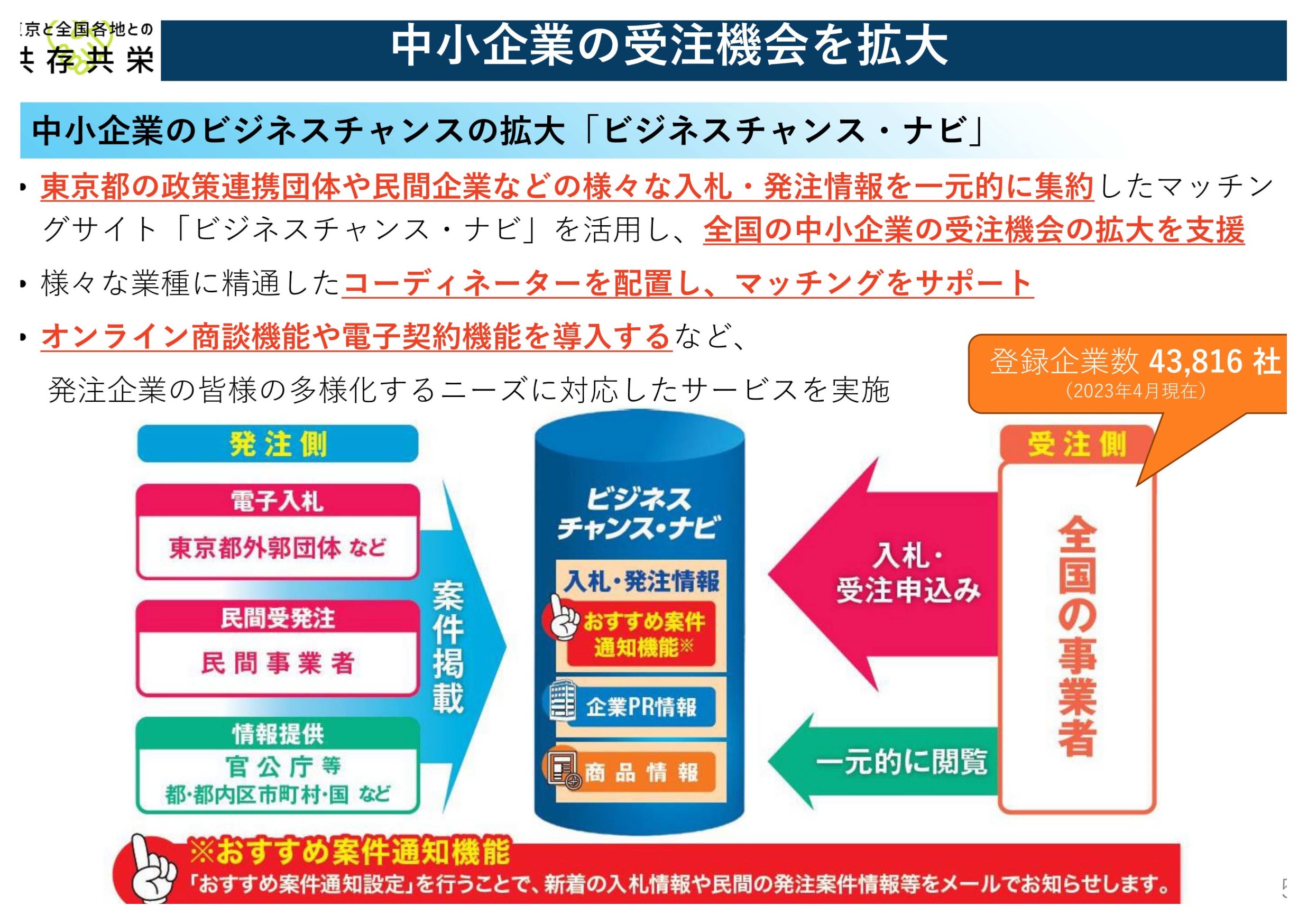 ・企業や東京都外郭団体等の様々な入札・発注情報を一元的に集約し、ビジネスマッチングに活用。