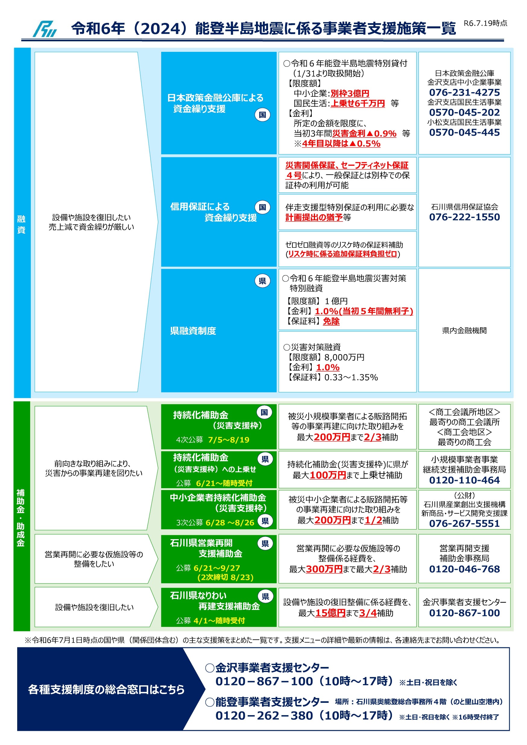 県内20商工会及び石川県商工会連合会では、地震・豪雨の影響を受けた中小企業・小規模事業者を支援します。相談ご希望の方は、最寄りの商工会又は石川県商工会連合会までご連絡ください。