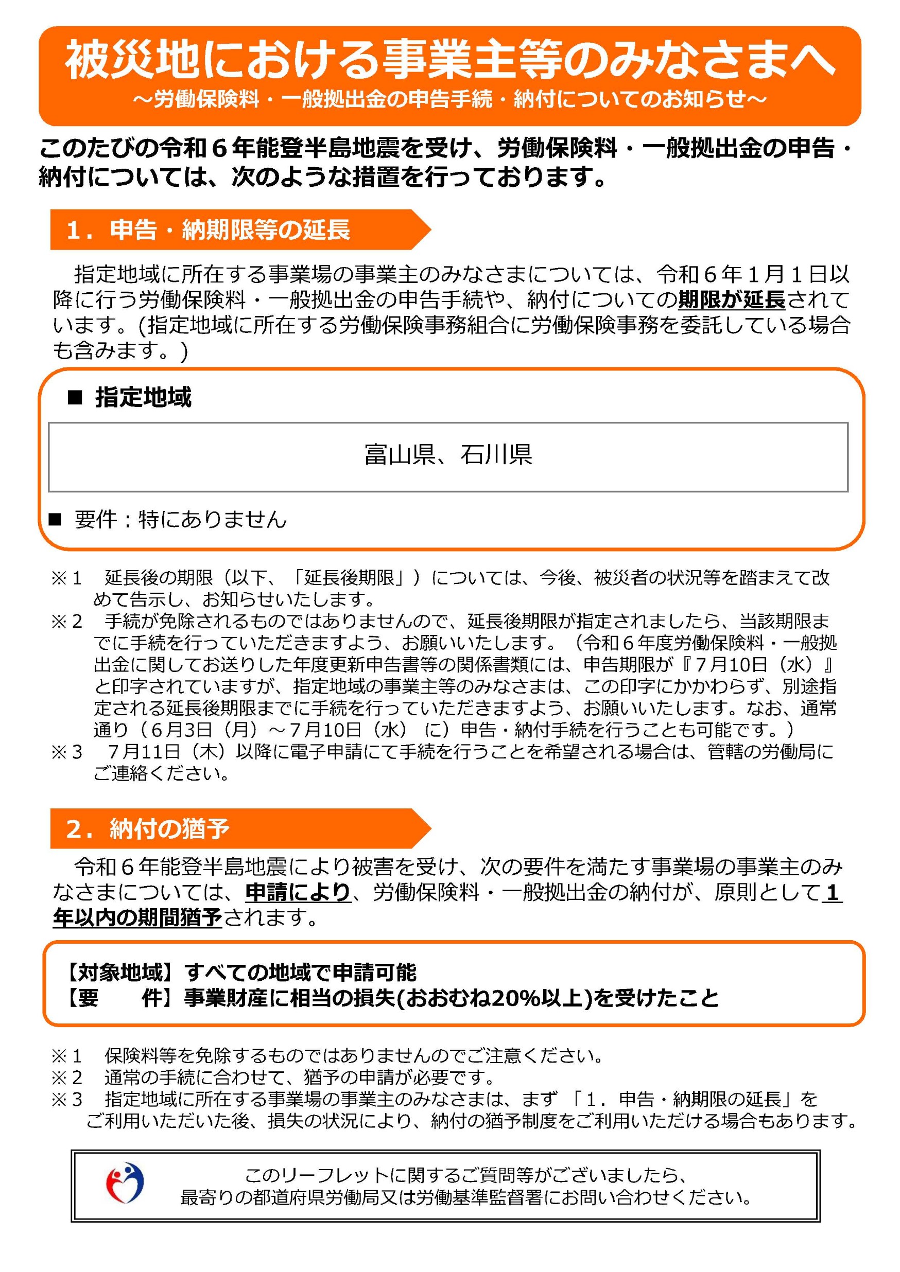 被災地における労働保険料・一般拠出金の申告納付について次のような措置をとっております。