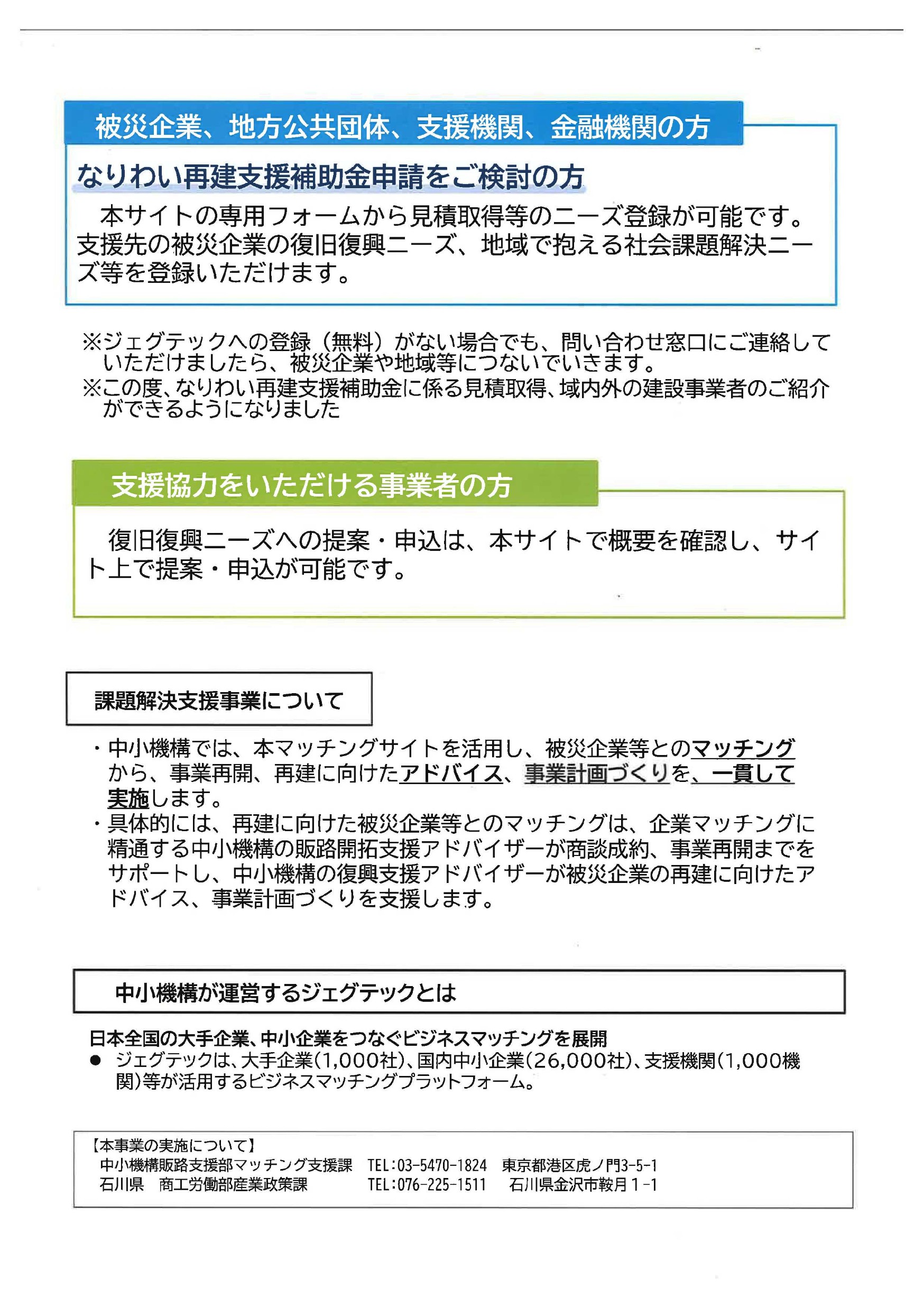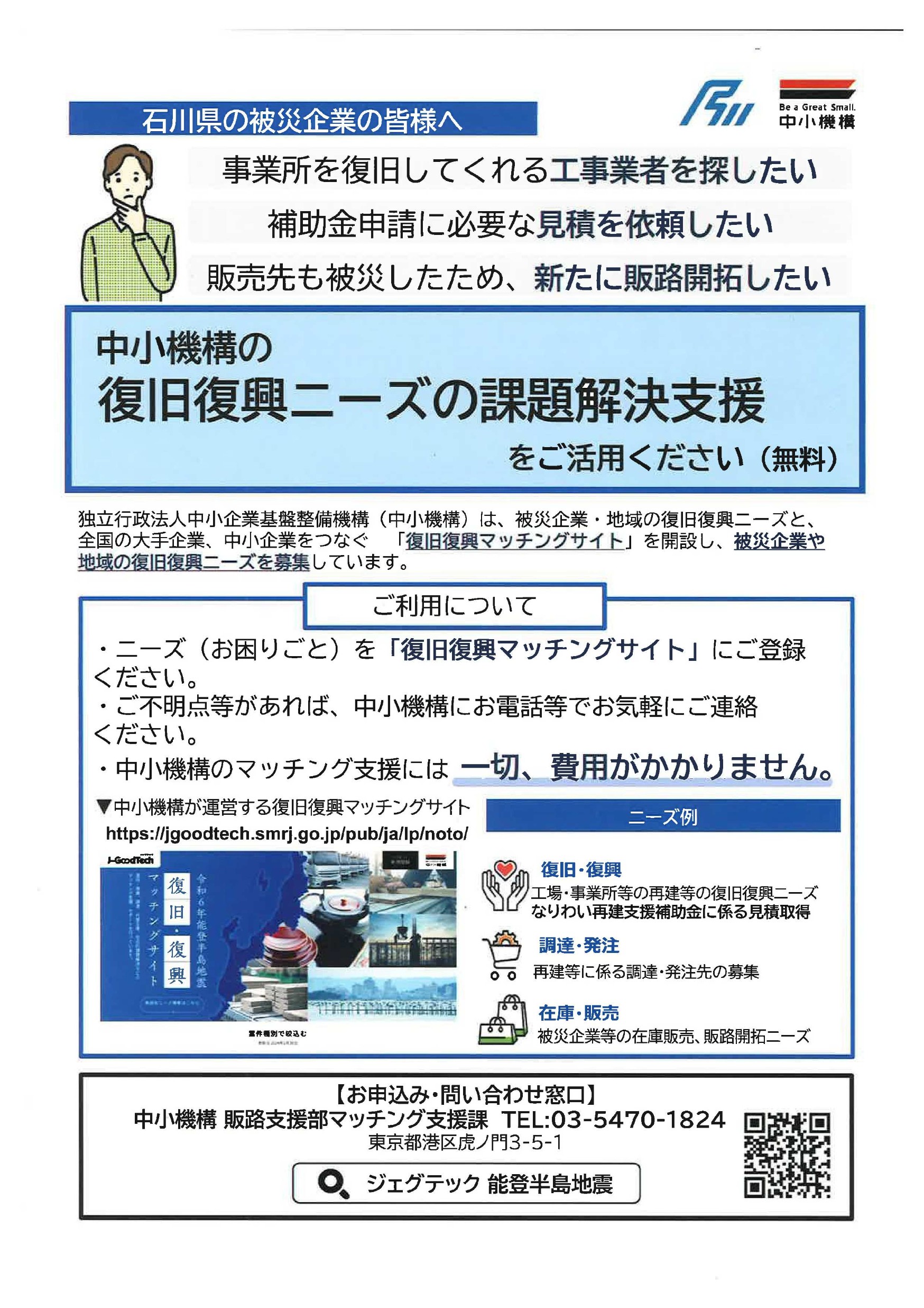 登録サイト:令和6年能登半島地震 復旧・復興 マッチングサイト | J-GoodTech-ジェグテック- (smrj.go.jp)