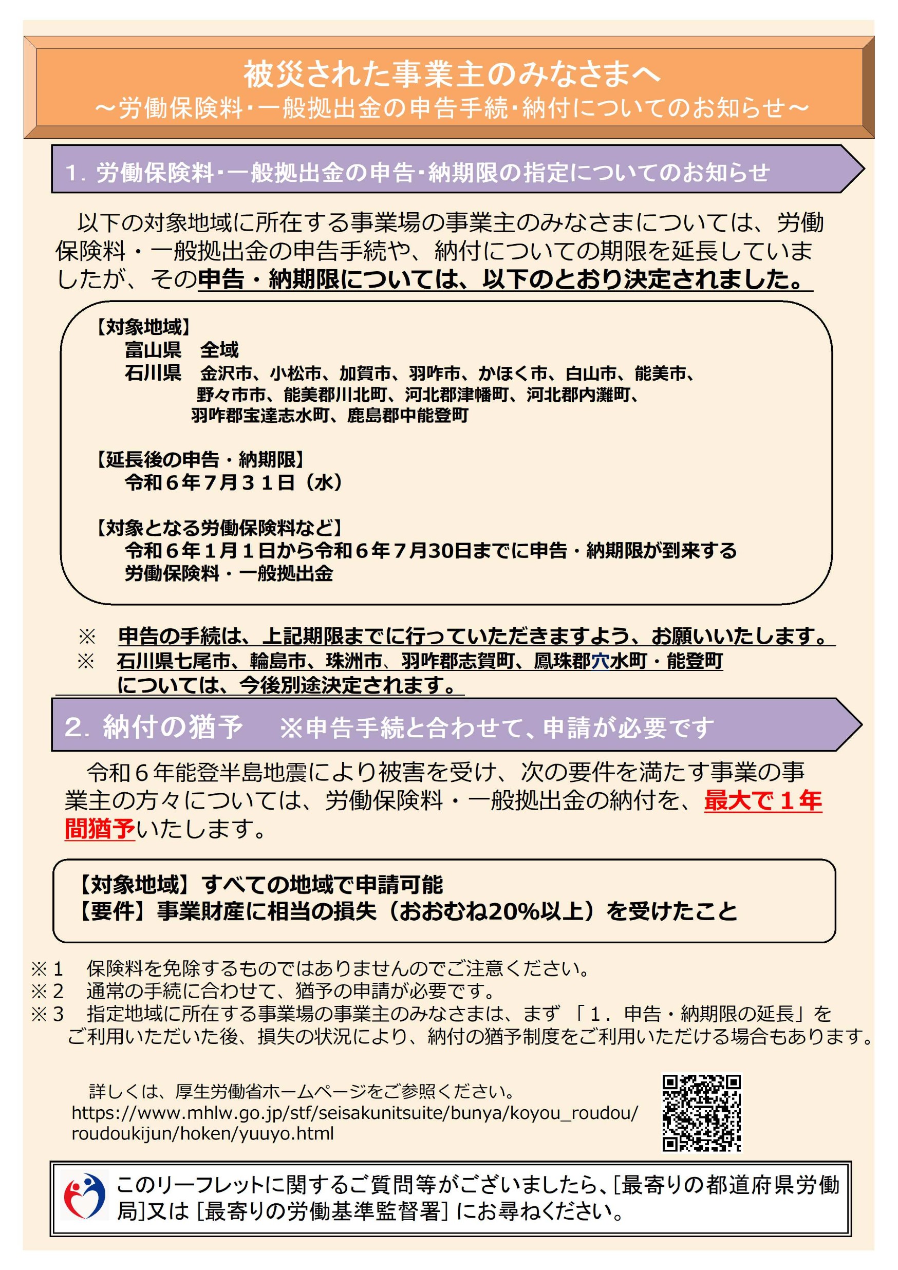 また、令和6年度能登半島地震により被害を受け、次の要件を満たす事業の事業主の方々については、労働保険料・一般拠出金の納付を、最大1年間猶予いたします。
