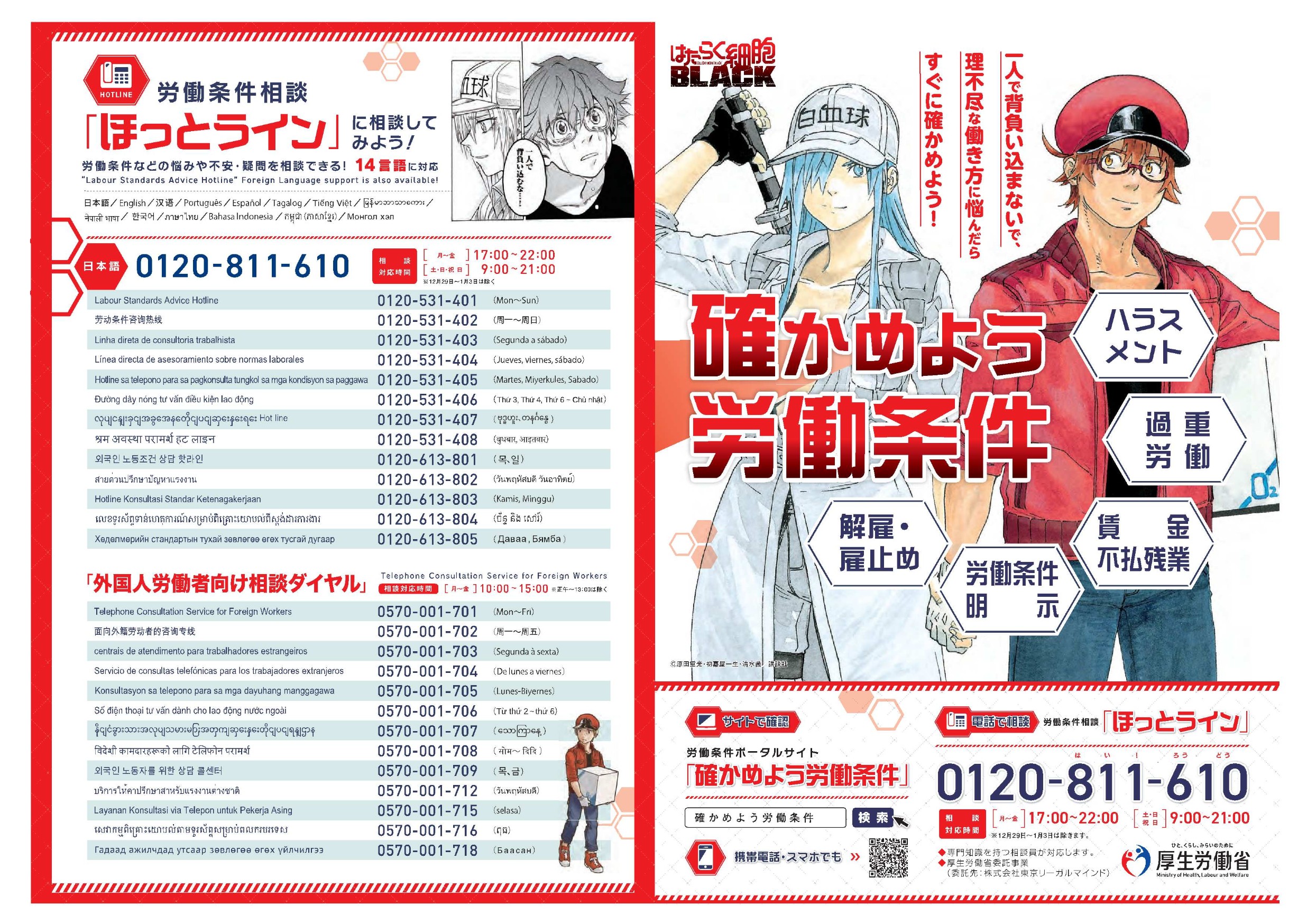 「労働条件相談ほっとライン」は労働基準監督署の開庁時間に日本語を含む14か国語で労働相談を受けることができるダイヤルとなっております。