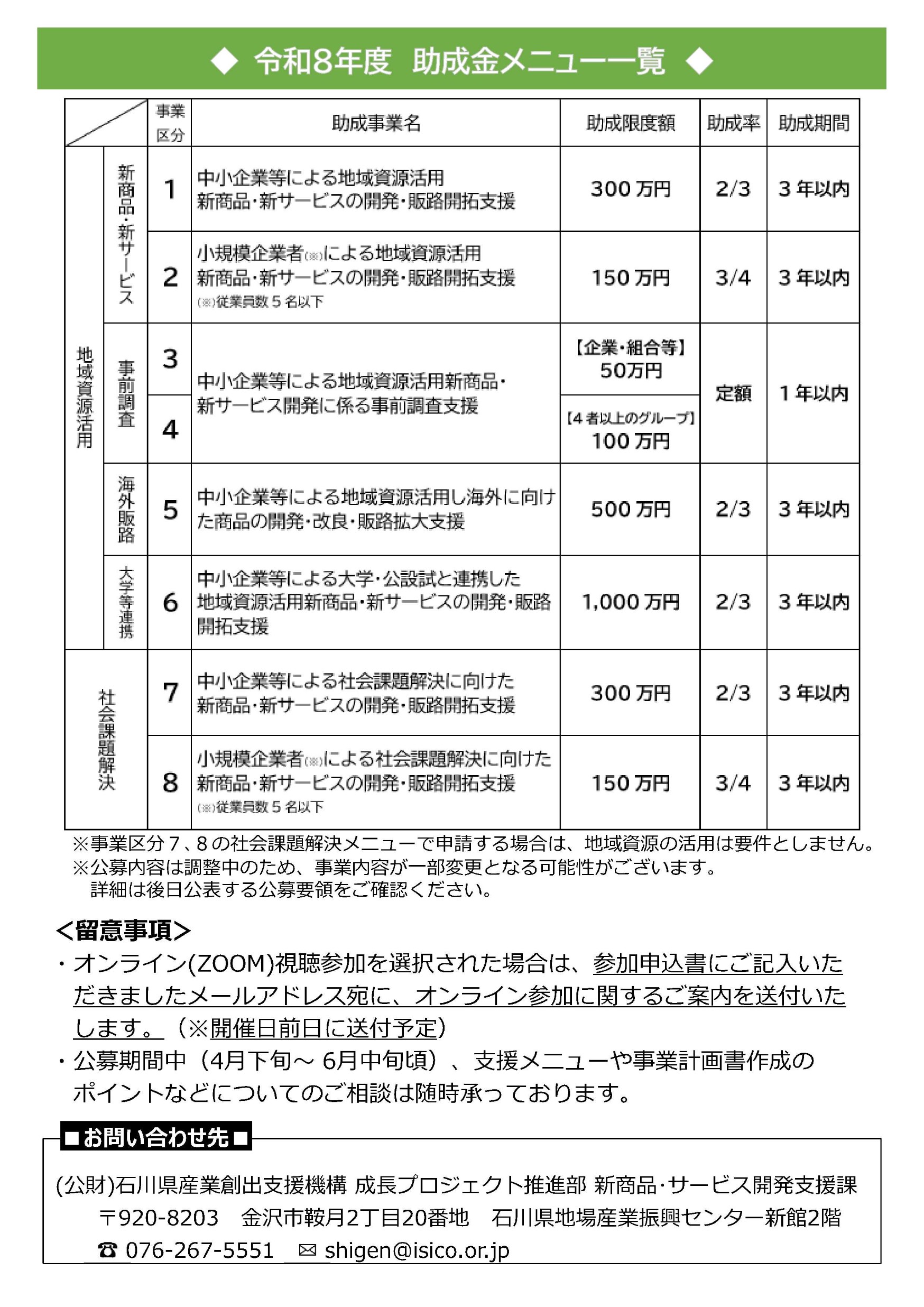 県では、700億円規模の「成長戦略ファンド」として研究開発支援、新商品・新サービス開発支援、スタートアップ創出支援等のメニューで、複数年にわたる新たな研究、商品開発から事業化、販路開拓まで、一貫して支援を行っております。 (参考)成長戦略ファンド:https://www.isico.or.jp/site/shinseihin/ R8年度は下記日程で公募説明会を実施いたしますので、関係者の皆様、研究開発・商品開発等に取り組まれる中小企業者等の皆様へ周知いただき、ご活用いただけましたら幸いです。 【公募説明会日程等】(詳細は添付のチラシをご覧ください) ●金沢会場(オンライン併用) 日時:4月22日(水) 10:30~11:20(研究開発支援事業) 13:30~14:10(新商品・新サービス開発支援事業) 会場:石川県地場産業振興センター 新館2階 第10研修室 定員:60名程度 ●加賀会場 日時:4月23日(木) 10:30~11:20(研究開発支援事業) 13:30~14:10(新商品・新サービス開発支援事業) 会場:小松商工会議所 1階研修室101号室 定員:30名程度 ●能登会場 日時:4月28日(火) 13:30~14:10(新商品・新サービス開発支援事業) ※研究開発は個別相談のみ14:15~16:15 会場:NOTOMORI(ノトモリ)(のと里山空港第一駐車場内) 定員:30名程度 【説明会申し込みフォーム】 ※分野で申込URLが異なります。 ※申し込み期限:4月20日(月)16時 <研究開発支援事業> 4/22金沢会場&オンライン https://www.isico.or.jp/ques/questionnaire.php?openid=477 4/23加賀会場 https://www.isico.or.jp/ques/questionnaire.php?openid=478 4/28能登会場(個別相談会のみ) https://www.isico.or.jp/ques/questionnaire.php?openid=479 <新商品・新サービス開発(全日程共通)> https://www.isico.or.jp/ques/questionnaire.php?openid=218<https://www.isico.or.jp/ques/questionnaire.php?openid=218&check>